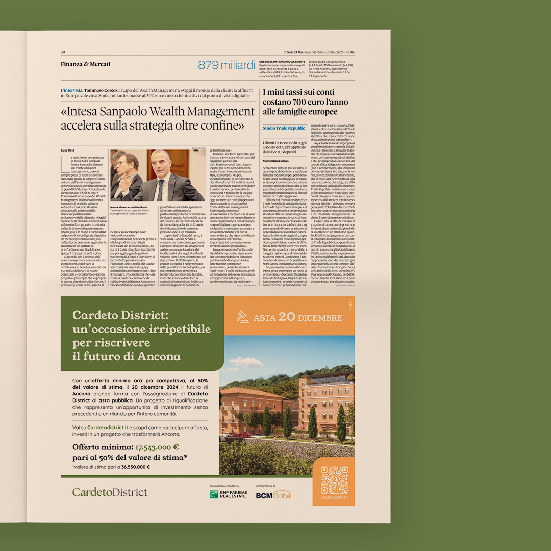 La campagna pubblicitaria, dallo stile istituzionale e persuasivo perfettamente calibrato per il pubblico delle testate economico-finanziarie, ha comunicato l’asta pubblica attraverso una headline incisiva e una bodycopy chiara e informativa. È uscita su Il Sole 24 Ore, Ancona Today e Milano Finanza.
