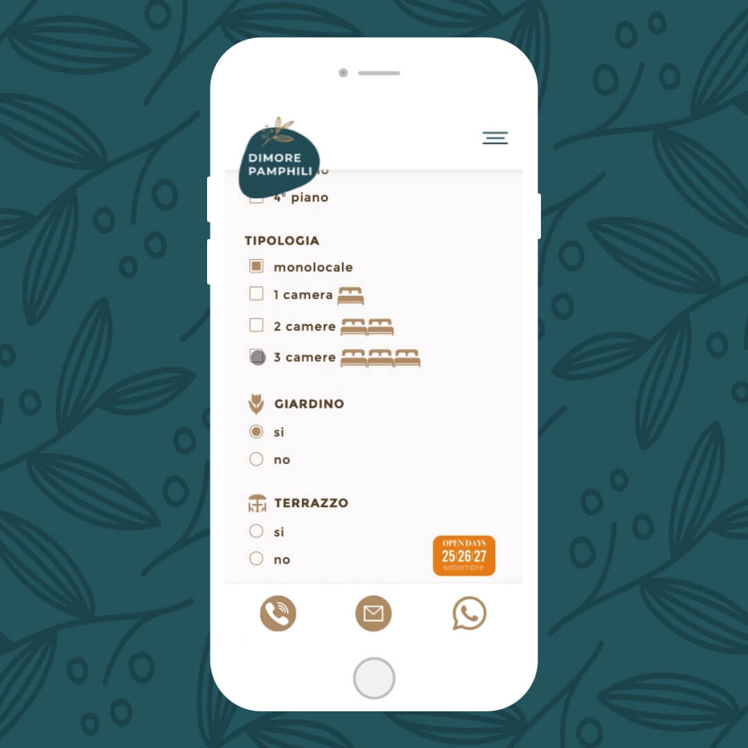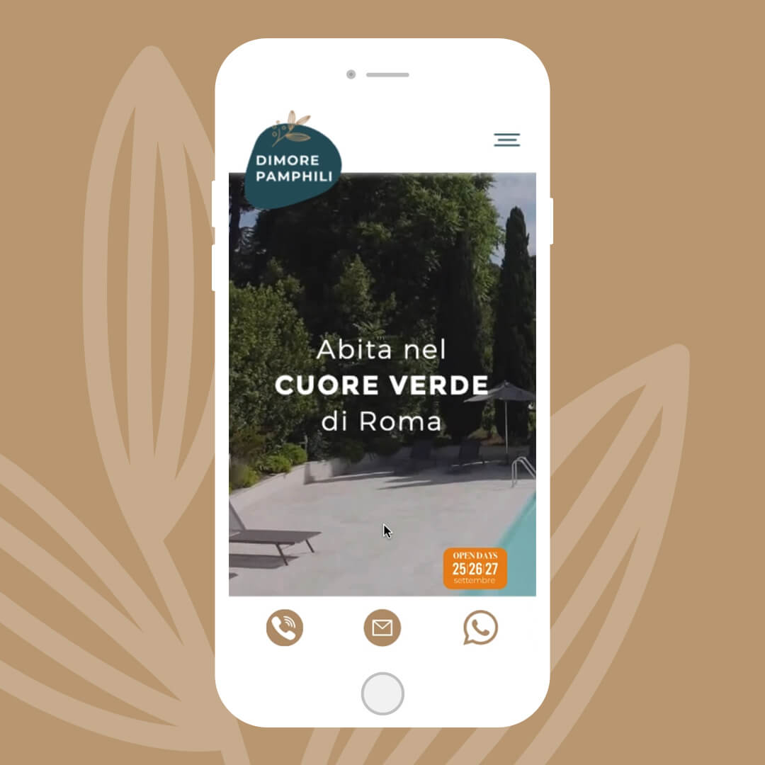 Il web site di Dimore Pamphili nasce mobile first, oggi quasi l'83,1%% degli utenti lo naviga con smartphone. Le Call To Action facilitano le richieste di contatto tramite form, telefonata e WhatsApp.