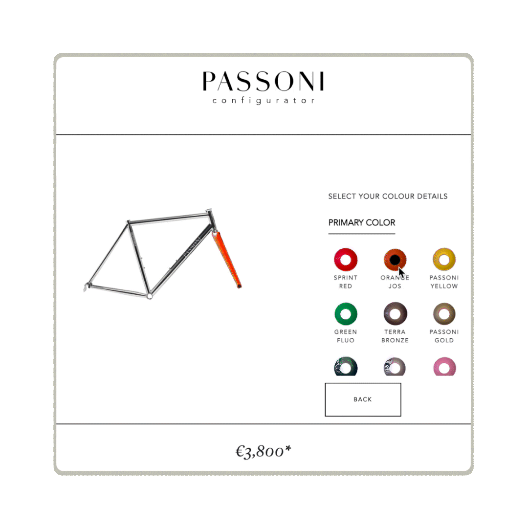 Il configuratore, in grado di personalizzare gli elementi delle biciclette, è il focus centrale di questo sito. Si può comporre e visualizzare in tempo reale la propria bicicletta e salvarla online, scaricarla in pdf o acquistarla. È stato realizzato con il framework Vuejs che si interfaccia con il backend sviluppato in Laravel.